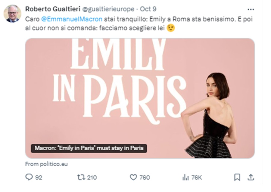 Rome’s mayor, Roberto Gualtieri, responded to Macron with a playful retort on X, saying, “Dear Emmanuel Macron, don’t worry: Emily is fine in Rome. And as we know, the heart goes where it wants; we let it choose.”