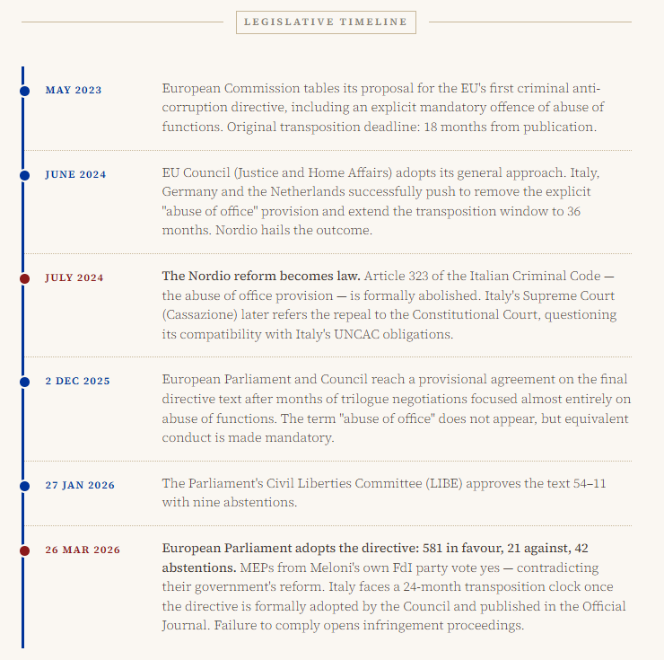 The trilogues between Parliament and Council then ran for months, with the abuse of office provision dominating nearly every session. The final compromise of December 2025 removed the precise label but retained the substance, leaving legal experts broadly agreed that the conduct it mandates overlaps significantly with what Article 323 of the Italian Criminal Code, abolished by the Nordio reform, had covered.